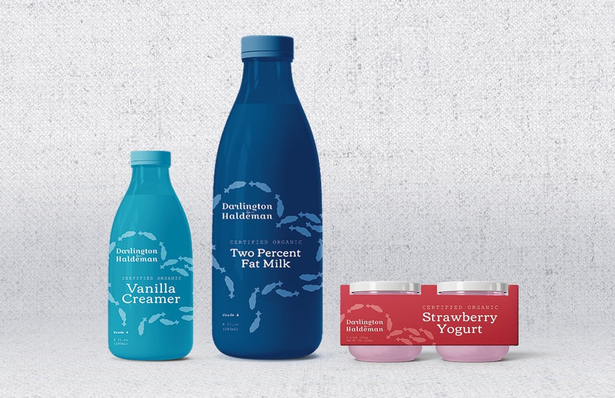The main goal for the design of Darlington & Haldeman was to highlight ethical farming in a brand new way. To stray from the tropes of real cows on white packs we currently seen on dairy shelfs and find a more contemporary and eye catching way to celebrate respectful farming.